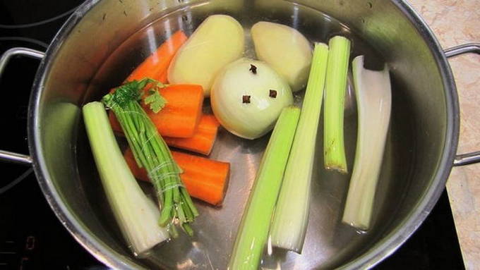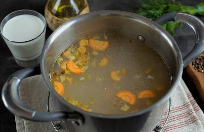 - Doe een soepstel, een middelgrote ui en een wortel in een pan. Vul het voedsel met water, voeg zout toe en zet de pan op hoog vuur op het vuur. Als het water kookt, zet je het vuur lager en laat je de bouillon een half uur sudderen.