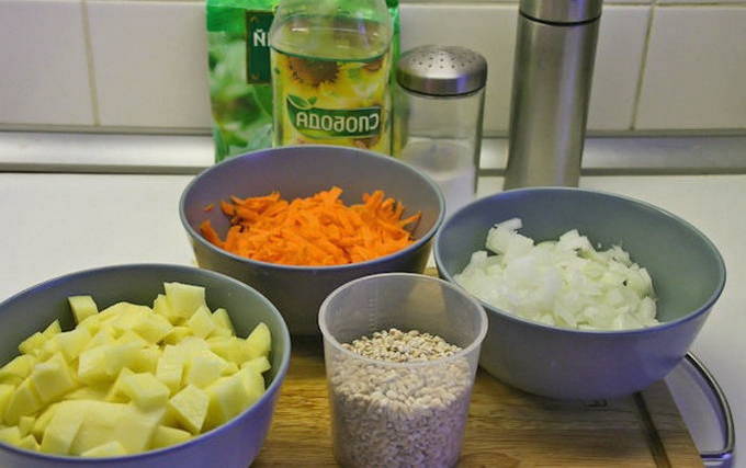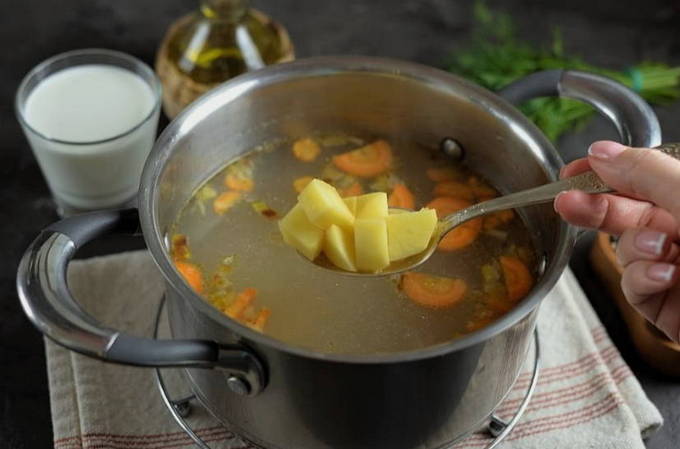 - We zetten een pot bouillon op een klein vuurtje. Terwijl het opwarmt, spoelt u de gierst onder stromend water en schilt u de aardappelen voor vissoep. Snijd de geschilde aardappelen in grote blokjes.