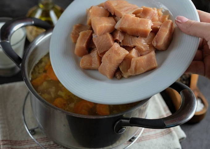 Heerlijke en rijke vissoep met gerst, waarvoor het helemaal niet nodig is om hele vis te gebruiken. De soep smaakt erg rijk en is meerdere dagen houdbaar.