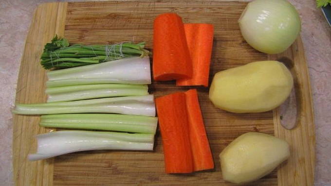 - We beginnen met het maken van groentebouillon. Snijd de wortel en bleekselderij grof, schil de aardappelen en uien. We steken een kruidnagel in de ui. Rol de peterseliestengels op en bind ze vast met een draad.