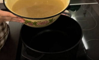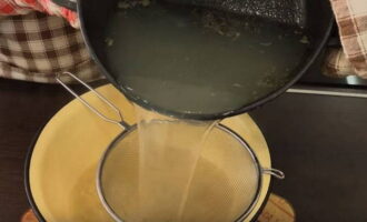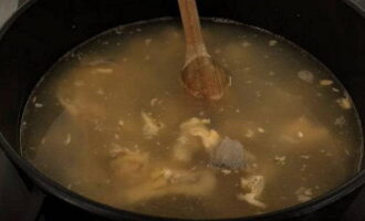 - We filteren de bouillon, doen de pulp erin en koken de botten, vinnen en kraakbeen ongeveer 10 minuten in een vergiet.