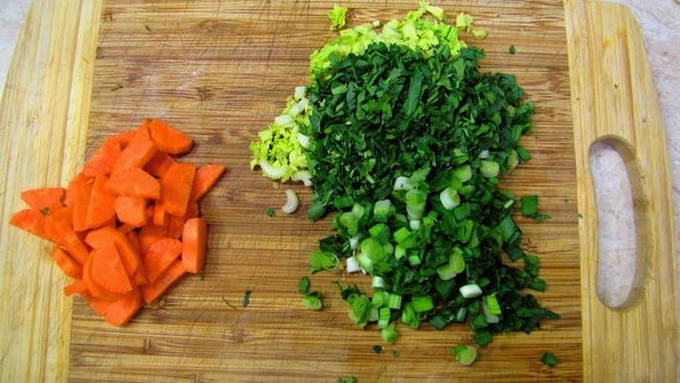 - Snijd de wortel in halve cirkels en hak de peterselie en bleekselderij fijn met een mes.