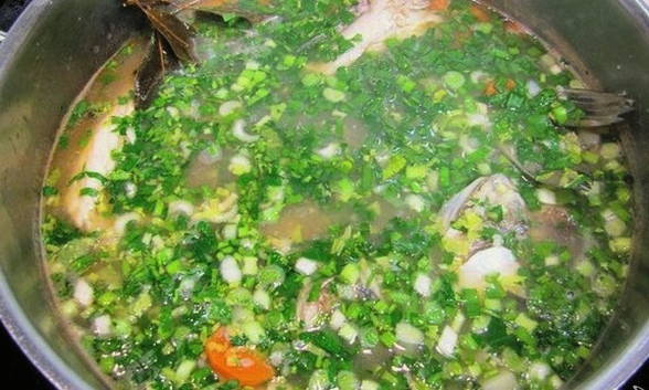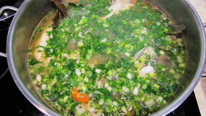 - Breng het oor voor de laatste keer aan de kook, voeg fijngehakte greens toe en zet het vuur uit.