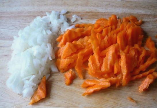 - Pel de ui en snij in kleine stukjes. Ook maken we de wortelen schoon en snijden ze in grotere stukken. Bak de uien met wortelen tot de uien licht goudbruin zijn.