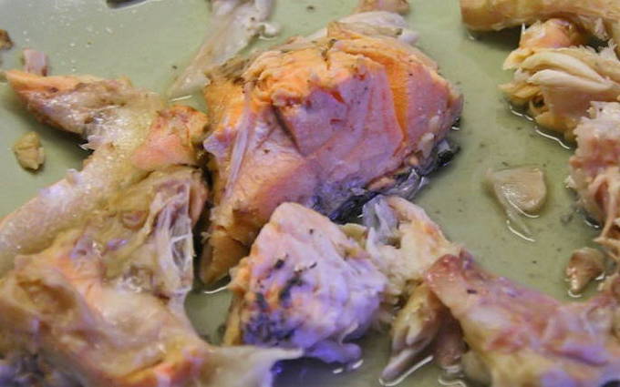 - We halen de vis, uien en wortels uit de bouillon, scheiden het vruchtvlees van de botten en het kraakbeen.