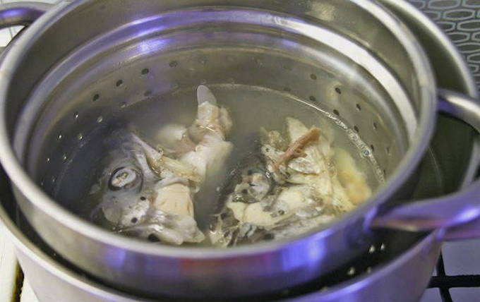 - Giet koud water in een pan en doe de botten, staart en kop erin. Laat de bouillon op laag vuur ongeveer 25 minuten sudderen.
