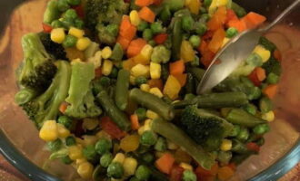We bereiden het ontdooide groentemengsel. Het moet erwten, maïs, broccoli, wortelen en asperges bevatten.