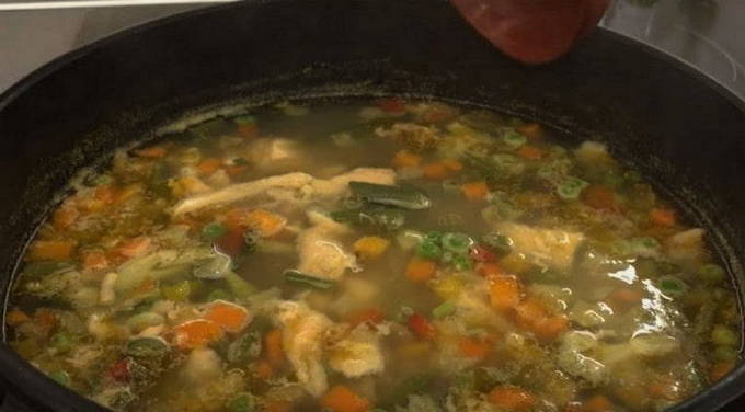 Voeg groenten toe aan de kokende bouillon, roer en kook op laag vuur gedurende ongeveer 15 minuten.