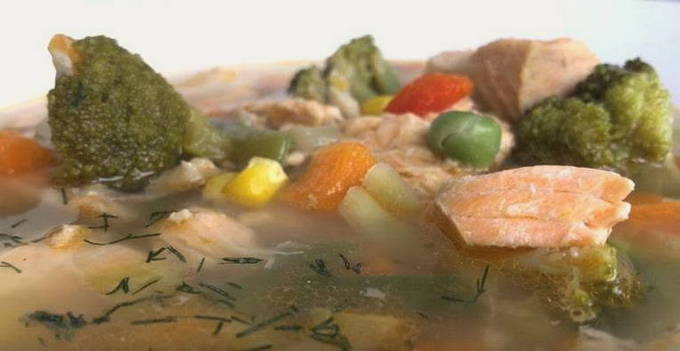 Nogal een budget, maar niet minder smakelijke optie voor het koken van forelvissoep. Bovendien verkort u de kooktijd merkbaar door het gebruik van een in de handel verkrijgbare “Mexicaanse” groentemix. Dergelijke vissoep kan gemakkelijk en snel thuis worden gekookt, maar tegelijkertijd blijft de smaak van de vissoep het meest klassiek.