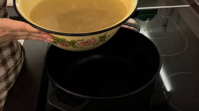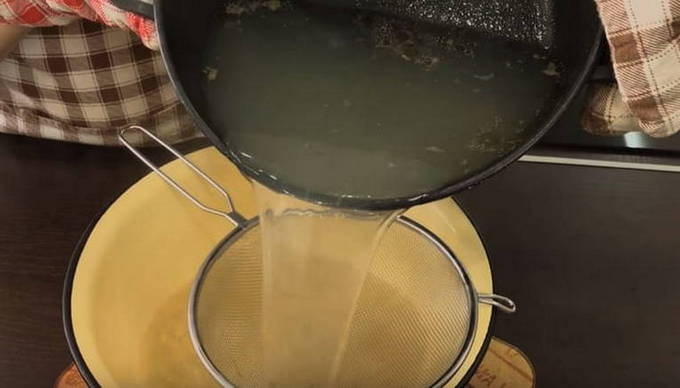 - We filteren de bouillon, doen de pulp erin en koken de botten, vinnen en kraakbeen ongeveer 10 minuten in een vergiet.