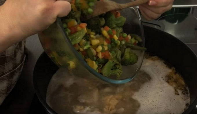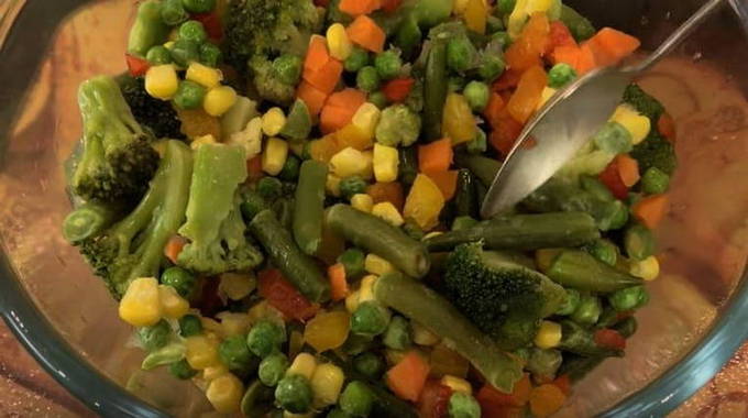We bereiden het ontdooide groentemengsel. Het moet erwten, maïs, broccoli, wortelen en asperges bevatten.