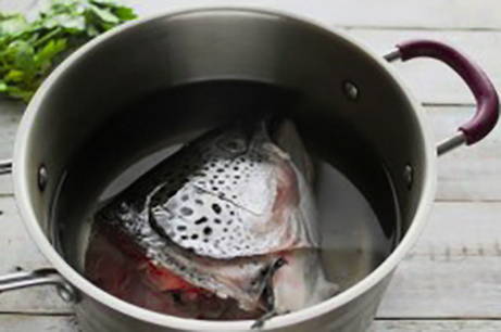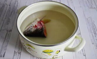 Was de vis grondig onder stromend water, snij de kop eraf. Giet koud water in een pan, steek je hoofd erin, breng aan de kook en kook nog 5 minuten.