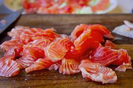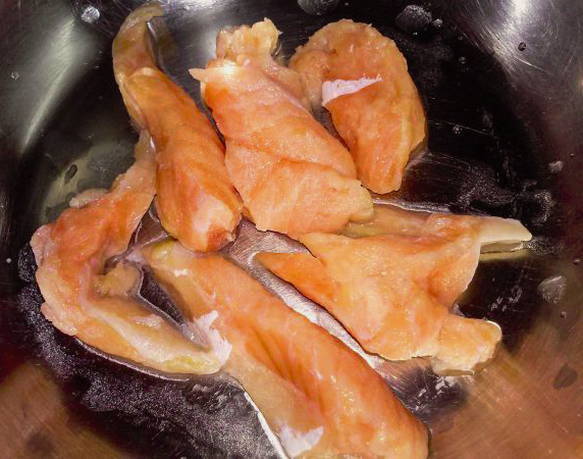 - Giet water in een pan en zet in brand. Was de buikjes van de zalm en haal de filets los van het vel.