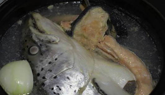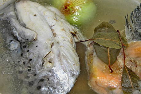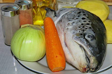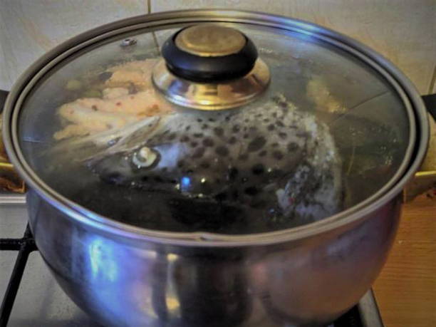 - Snijd het hoofd van het karkas af, verwijder de kieuwen. Doe de kop, ui en kruiden in een ketel, giet er water in en kook gedurende 20 minuten.