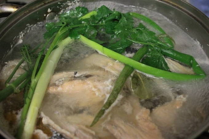 - Vul de vis met water, breng aan de kook, verwijder het schuim. Voeg zout, peper en kruiden toe aan de bouillon, kook gedurende 20 minuten.
