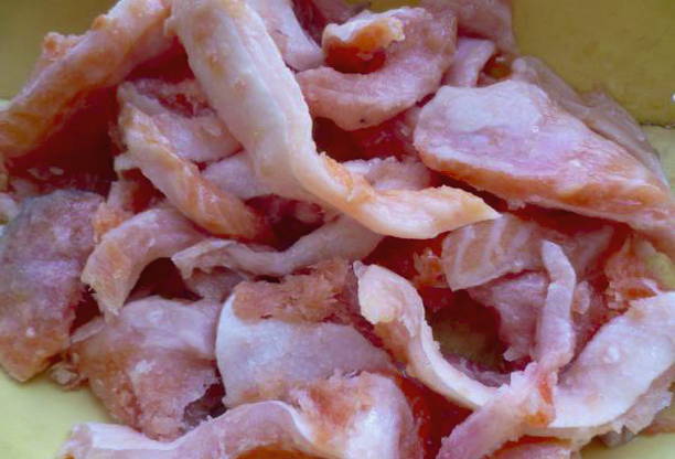 - Spoel het zalmkarkas grondig onder stromend water, verwijder bloedstolsels, overblijfselen van ingewanden en kieuwen.