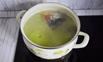 - Breng de bouillon aan de kook, verwijder het schuim en zet het vuur lager. Kook 40 minuten tot de vis gaar is.