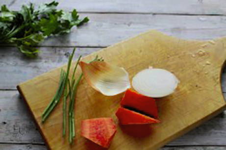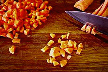 - Snijd de ui en wortel fijn en bak in boter tot ze licht goudbruin zijn.