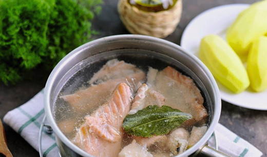 - Verwijder het vruchtvlees van de staart en kop, doe het in de bouillon, voeg ook kruiden en zout toe. Kook de vissoep tot de aardappelen gaar zijn, haal dan van het vuur en laat 10-15 minuten onder het deksel trekken.