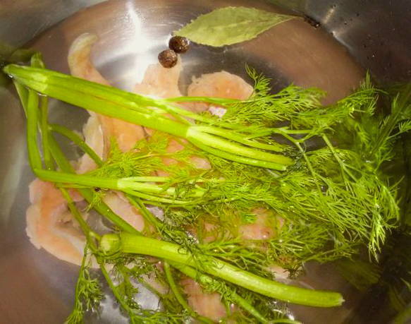 - Giet water in een pan, voeg de zalmruggen toe en kook de bouillon 25-30 minuten na het koken. Voeg na 20 minuten koken peperkorrels en laurierblaadjes toe.