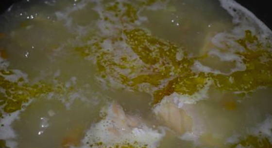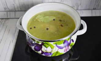 - Schep regelmatig het schuim van het oppervlak van de bouillon. Voeg na het koken kruiden toe, zet het vuur lager, dek de pan af met een deksel en kook 15-20 minuten.
