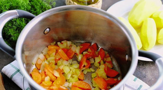 - Snijd de aardappelen en de andere helft van de ui fijn. Voeg groenten toe aan de bouillon en kook tot ze half gaar zijn.