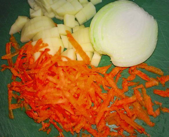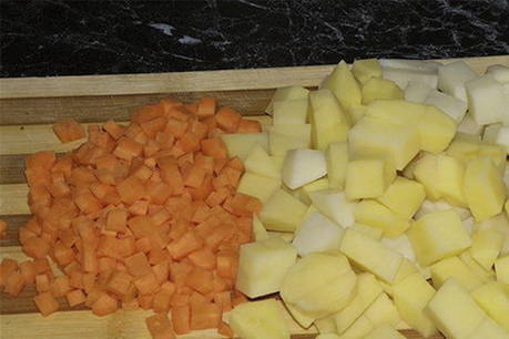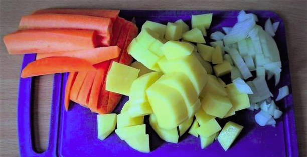 - Schil en was groenten. Snijd uien en aardappelen in blokjes, wortelen in dunne reepjes.