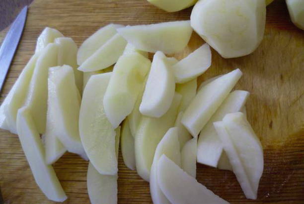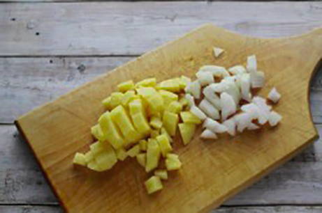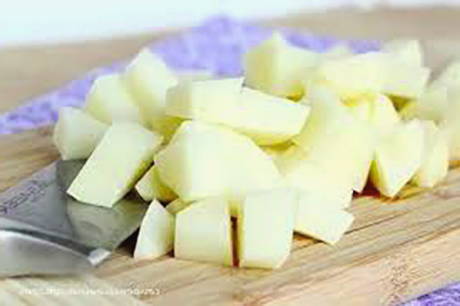 - Schil de aardappelen, was ze, snijd ze willekeurig in stukjes en doe ze in een pan.