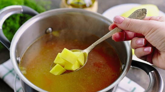 - Zeef vervolgens de bouillon, giet in een pan, voeg de in blokjes gesneden aardappelen toe en kook 5 minuten.