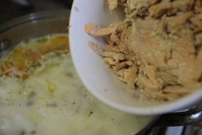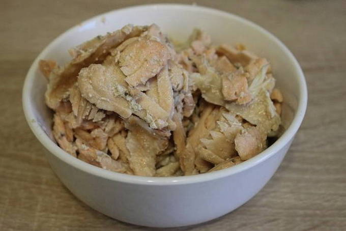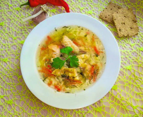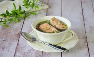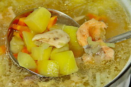 - Haal de zalm uit elkaar, scheid de filet van de botten. Voeg de filets toe aan de bouillon, roer, breng op smaak met zout, breng aan de kook en haal van het vuur. Serveer de vissoep met een sneetje vers brood.