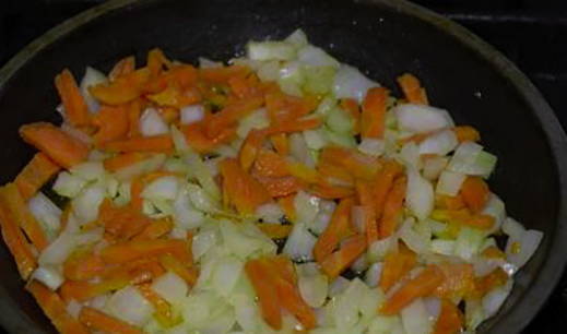 - Tegelijkertijd, in een andere pan met een dikke bodem, verwarm de plantaardige olie, doe de uien en wortels in blokjes gesneden. Fruit de groenten tot ze licht goudbruin zijn.