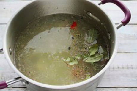 - Voeg dille, peperkorrels en laurier toe, giet er water bij.