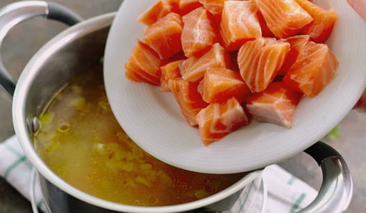 - Snijd de zalmfilet in grote stukken, stuur naar de bouillon en kook 3-5 minuten.