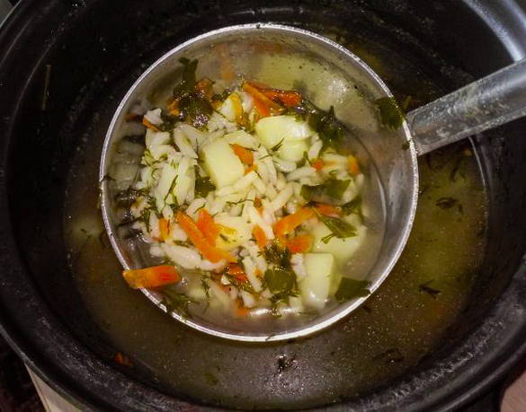 - Voeg daarna aardappelen en rijst toe aan de bouillon, kook nog 15 minuten.