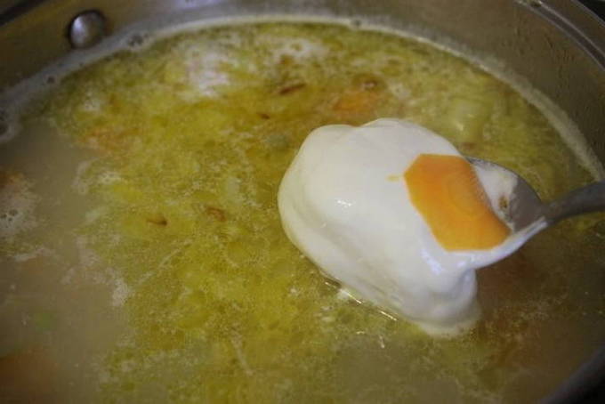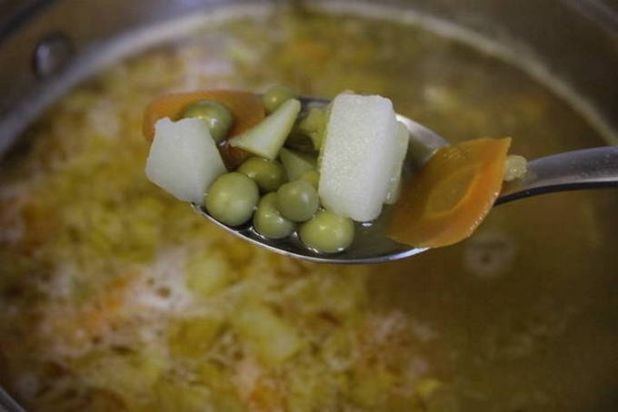 - Voeg de gesauteerde groenten en doperwtjes toe aan de bouillon, kook nog 5 minuten.