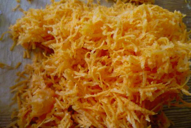 - Schil de wortelen en snijd ze in blokjes, je kunt ze raspen op een grove rasp.