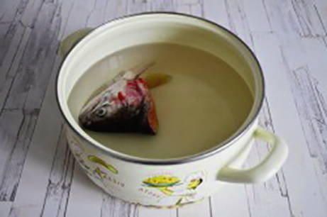 Was de vis grondig onder stromend water, snij de kop eraf. Giet koud water in een pan, steek je hoofd erin, breng aan de kook en kook nog 5 minuten.