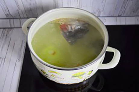 - Breng de bouillon aan de kook, verwijder het schuim en zet het vuur lager. Kook 40 minuten tot de vis gaar is.