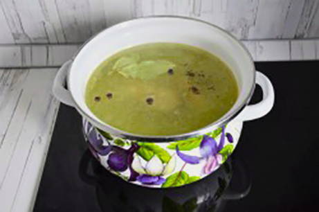 - Schep regelmatig het schuim van het oppervlak van de bouillon. Voeg na het koken kruiden toe, zet het vuur lager, dek de pan af met een deksel en kook 15-20 minuten.