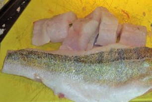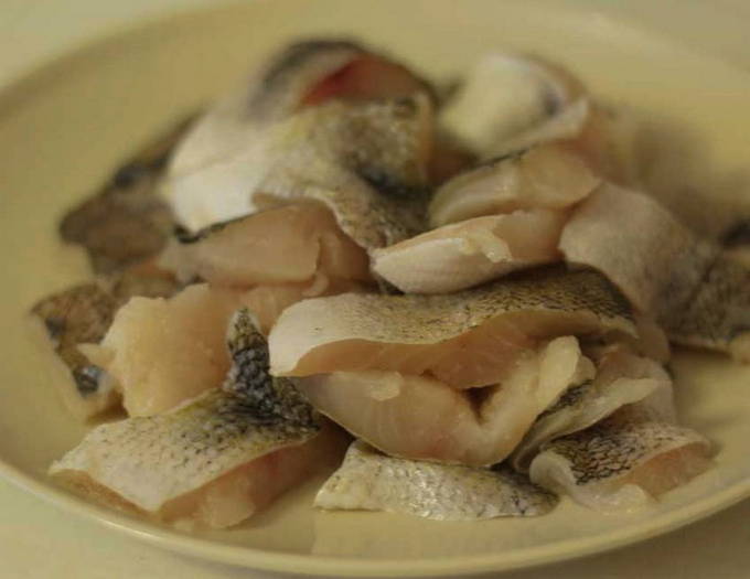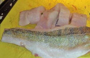 - Snijd de snoekbaarsfilet in kleine stukjes.