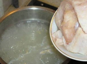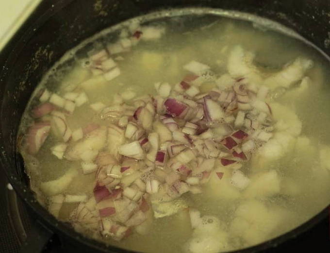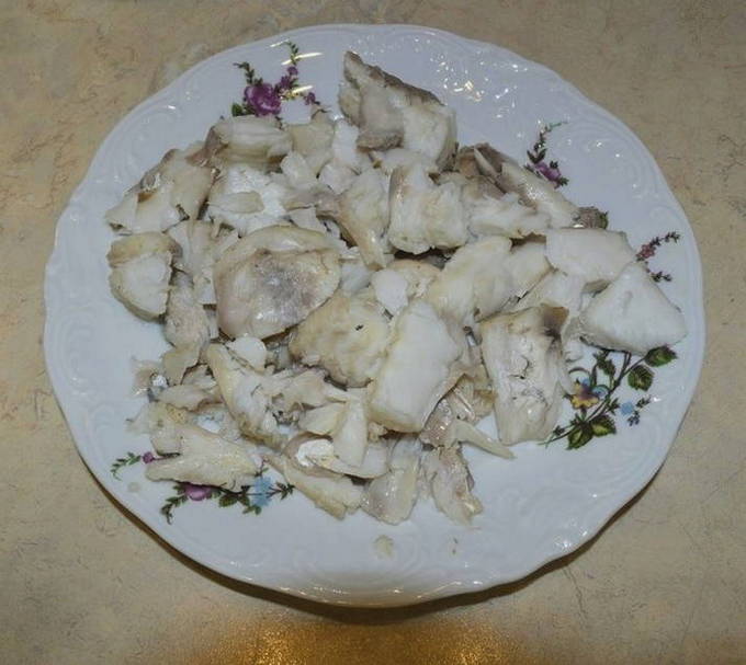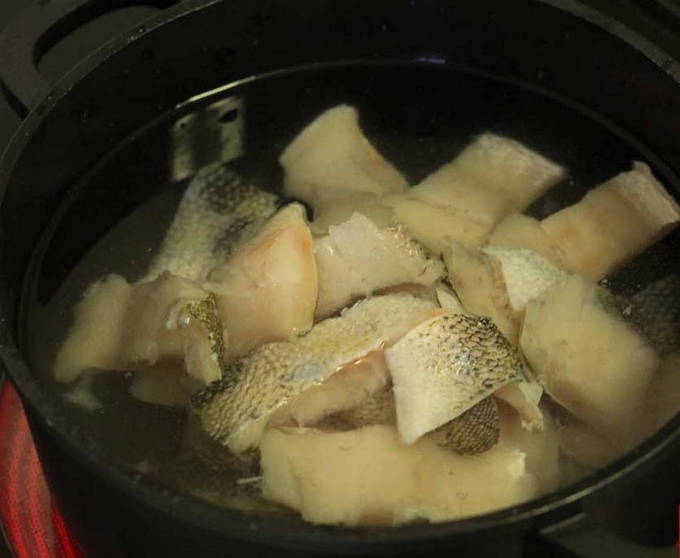We maken de snoekbaars schoon, verwijderen de binnenkant, kieuwen en ogen. Verdeel de vis in kleine stukjes. We doen ze in een pan en vullen met water. Voeg daar het hoofd, de vinnen en de staart toe. We zetten de vis op het fornuis om te koken en niet te vergeten het schuim te verwijderen na het koken van het water.