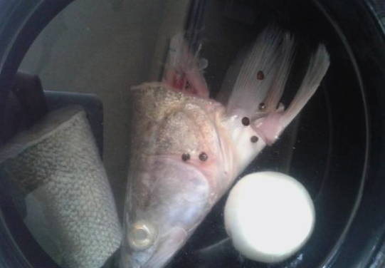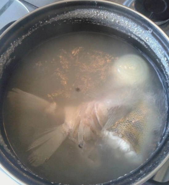 - We wassen de staart en de kop van de snoekbaars onder stromend water en doen in een pan. Giet water en stuur de pan naar het fornuis. Zet matig vuur aan en doe peperkorrels en uien in een pan.