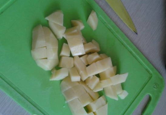 Voeg de hele ui en kruiden toe aan de bouillon. Kook op laag vuur ongeveer 20-25 minuten. Snijd de wortel in kleine blokjes en de aardappelen in middelgrote blokjes.