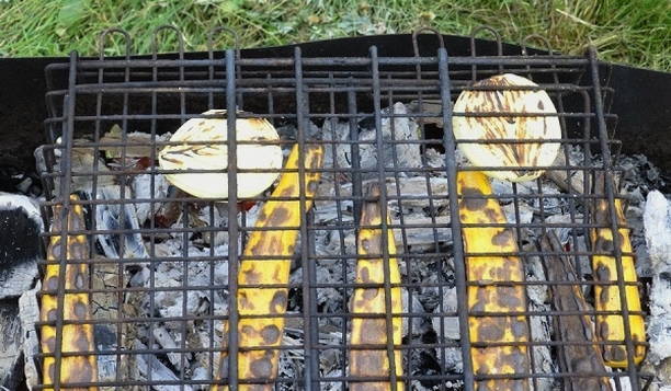 - Schil de wortelen en uien en snijd ze in grote stukken. Leg ze op een rooster en bak ze aan beide kanten knapperig boven het vuur.
