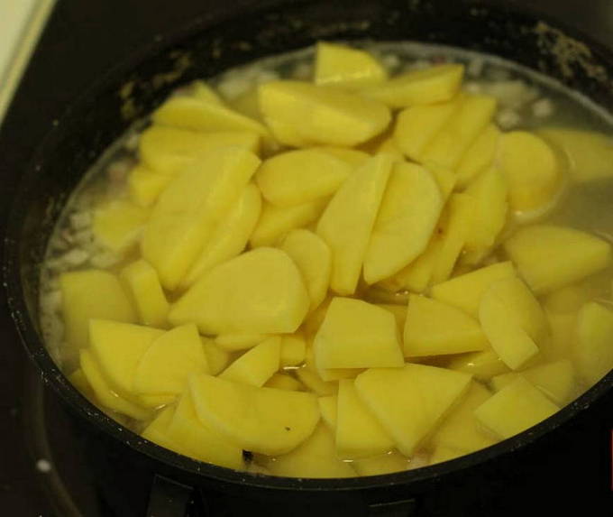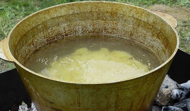 - Giet water in de ketel, voeg er aardappelen aan toe en zet hem in brand. Als het water kookt, bestrooi het dan met zout.