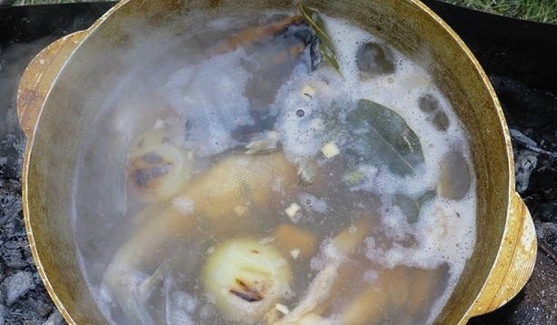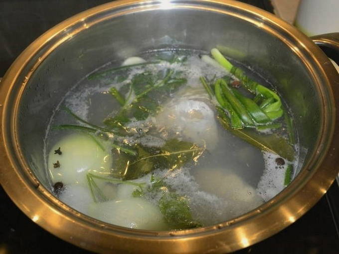 - Zet het vuur lager als het water kookt en laat de bouillon een half uur sudderen.