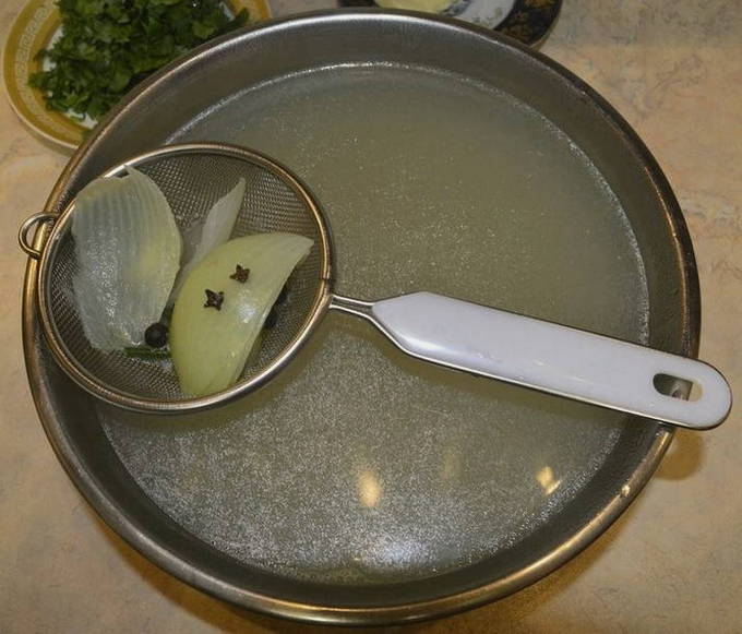 - Zeef de afgewerkte bouillon, scheid de vispulp van de botten en het kraakbeen.
