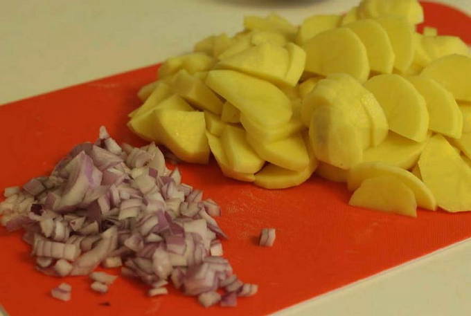 - Aardappels en uien schillen, hakken.