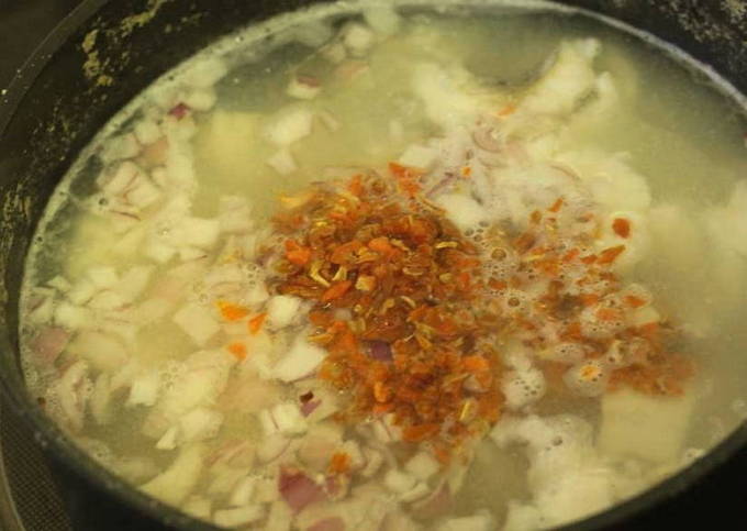 - We zetten de bouillon op een matig vuur, zodra het kookt, voeg je de gierst toe. Voeg na 2 minuten de vispulp, kruiden en olie toe. Kook nog 2 minuten en haal het oor van het vuur. Eet smakelijk!