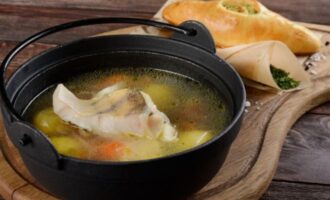 We luisteren naar de vis, ui met laurierblaadjes uit de pan en filteren de bouillon. Voeg er boter aan toe en steek het vuur weer aan. We sturen wortelen en aardappelen naar de bouillon, zout en peper. Als de groenten gaar zijn, doe de vis in een pan en kook nog 5 minuten.